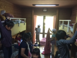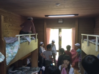 両側が2段ベッドになっています。今夜はここで寝ます。誰が上に寝るか”じゃんけん”でしょうか?部屋を出たところに”ミーティングルーム”という広い場所があります。ちょっとみんなで協力して元町小学校の”元”という人文字を作ってみました。「読めますか?」