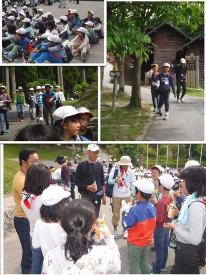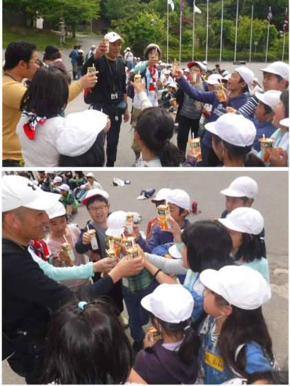 午後2時40分ごろ、山の家の奥のほうから一団が下山してきました。それぞれの顔はとても疲れ切っているようでしたが、とてもすっきりした顔でした。約5時間の登山道を走破した達成感が見られます。そして、ここでお別れの教頭先生と土井先生とでジュースで乾杯です。みんなのつながりを感じる乾杯でした。力が入りすぎてジュースが飛び散ってしまいましたが、素敵な時間を過ごしたことがわかります。