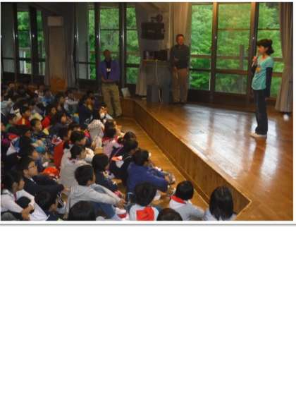 本日は5つの学校が集まって宿泊学習をしています。朝のつどいを一緒にします。一度にたくさんの子どもたち(200名以上)が集まります。一番に並んで一番に整列して待ちました。