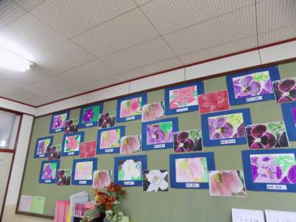 初めての図工の時間に描いた校内に咲いている春の花の絵が完成しました。丁寧に仕上げました。教室に貼ると,お花畑ができたようでした。
