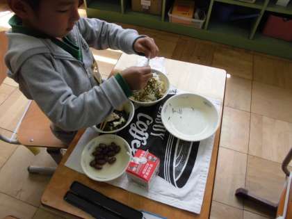 1年生は初めての丼です。のりがぱらぱらと散らばり手こずります。でも自分で仕上げた丼を,嬉しそうにもりもりと食べました。