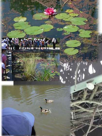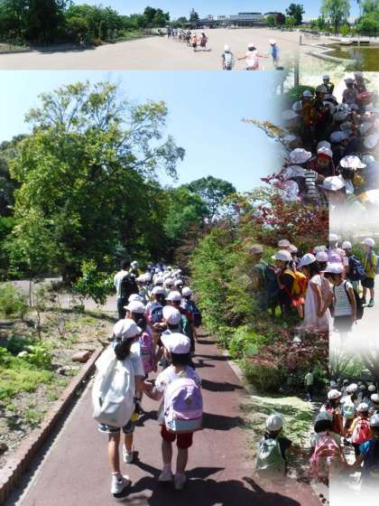 晴天の中,植物園へ行きました。1・2年生は一緒に活動することが多く,みんな仲良しです。遠足中に子どもたちが興味深くよく見て,歓声が上がることもありました。まずは,かたつむり。子どもたちの頭上「アケビ」の棚にいるのを発見しました。次はきれいな睡蓮の咲く池のほとりです。「あっ,オタマジャクシがいる。」「大きい鯉もいる。」そして,池のほとりです。「あのカモは親子かなあ。」という疑問の声が上がります。ダンゴ虫を見つけてかわいがっている姿も見られました。