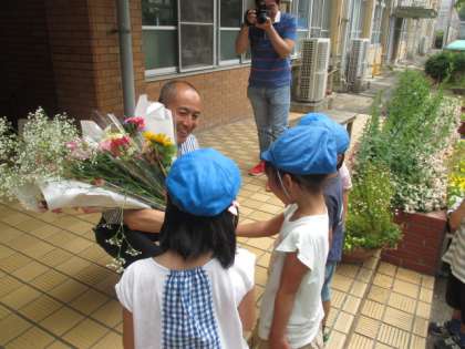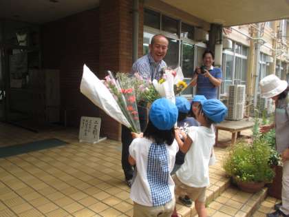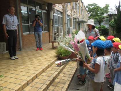 紫野幼稚園のかわいい園児さんたちが,お花を届けに来てくれました。「うんどうかいでうんどうじょうをつかわせてくれてありがとう。」と元気な声で言ってくれました。