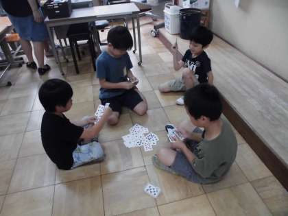 梅雨の時期がやってきました。外遊びができないので,1年生は教室でトランプをしています。「ばばぬき」をして楽しんでいます。一方大勢の子どもたちが集まっている所では,トランプで手品を披露しています。