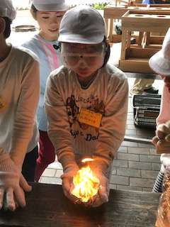 カレーをつくる野外炊事の前に,火おこしをしました。