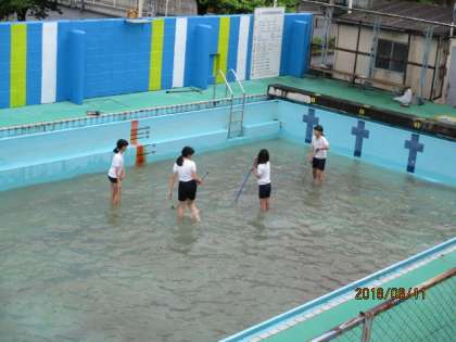 小雨が降る中、4・5・6年生がプール掃除をしてくれました。