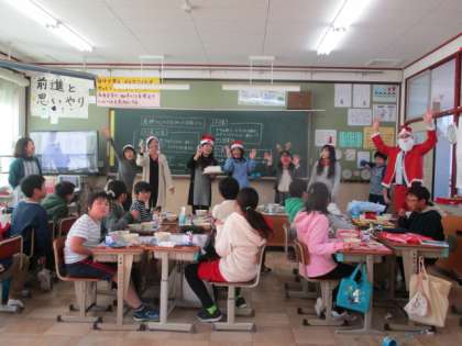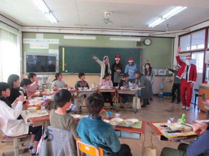 12月21日 給食の時間 1〜6年生の教室に、サンタさん御一行が、やってきました。にぎやかな、楽器隊もいっしょです。プレゼントは、おいしそうなチョコレートケーキ。みんな、大喜びです。