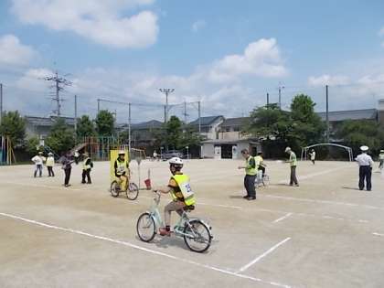 5月14日(火)4・5・6年生の自転車安全教室がありました。運動場で道路に見立てたコースを設営し,北警察署の方から説明を聞いた後,一人ずつ自転車に乗って,走行練習をした後,実技テストに挑戦しました。ジグザグ走行や遅乗り走行のテストもありました。子ども達は説明をしっかり聞いて,少し緊張しながら実技テストに取り組んでいました。午後から学科テストもしました。結果は実技テストと学科テストの結果を合わせて評価されます。後日,自転車運転免許証が交付される予定です。