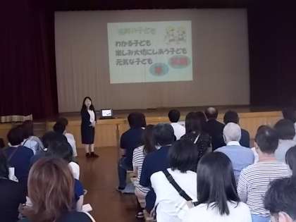 休日参観の4校時はどの学年も学級活動で風水害にそなえての安全学習をしました。その間に体育館では「元町教育説明会」で学校長から保護者の方へ今年度の本校の学校教育の取組について説明させていただきました。