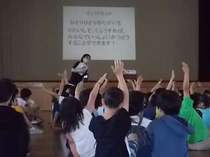 また,人権の日ということで,来年のパラリンピックの話から,車いすの友達が玉入れをする時を想定して,何が困るのか,一緒に楽しむにはどんな工夫をすればいいのかを考えました。一人一人の違いを理解して,工夫すれば一緒に活動することができることがわかりました。