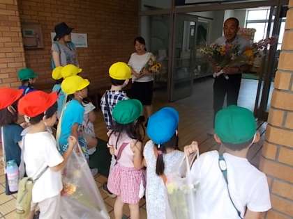近隣の幼稚園のかわいい子ども達が,お花を持ってきてプレゼントしてくれました。きれいな色とりどりのお花をたくさんいただきました。花瓶に分けて校内に飾らせてもらいました。ありがとうございます。