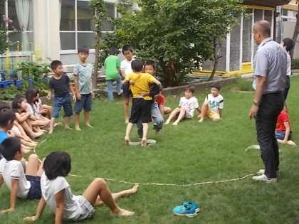 休み時間になると中庭に子どもたちが相撲の稽古をしに集まってきます。親方は教頭先生です。芝生の上に白い長縄で土俵を作り,順番に子どもたちが取組をします。勝負が決まると歓声が上がります。