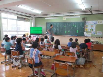 教室をのぞいてみると夏休みの自由研究を教室に飾ったり,新しくクラスの係決めをする様子が見られました。