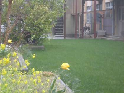 今日は雨が降っています。中庭のチューリップも雨に打たれています。
