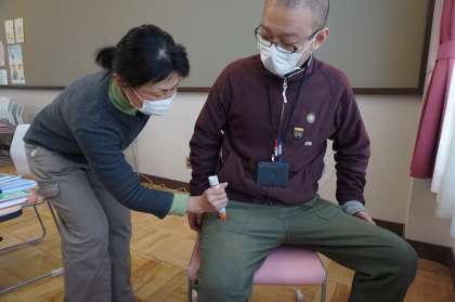 4月14日(火)午後,教職員研修として食物アレルギー緊急対応に関する研修会を行いました。学校給食における対応や配慮事項についての確認をし,エピペンの使い方の訓練をしました。また,児童が食物アレルギーを発症したという設定で,どのような体制や役割分担をすればいいかをグループごとに話し合いました。