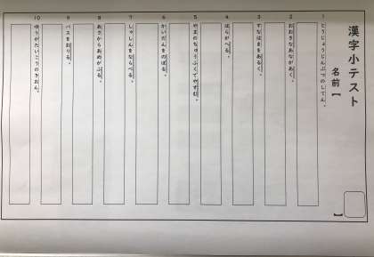学校が再開されるとそのページに書かれている文章を,正しく漢字を使って書くことができるか,小テストを実施します。2枚目の写真は小テストの見本です。