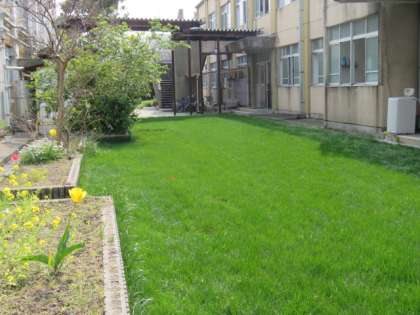 学校の中庭の芝生の緑がとても鮮やかな緑色になってきました。この芝生は地域の方のご協力で毎年すてきな芝生に成育しています。ウサギ小屋もあります。中には先日紹介したうさぎの「みる」がいます。日が当たるとぽかぽかしてとてもうれしそうにしています。子どもたちの人気の場所になっています。