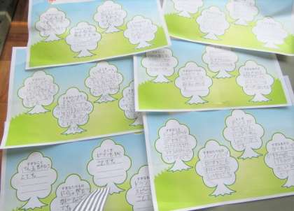 先生は きょう みんなが 9日に書いた じこしょうかいカードを もういちど 読みかえしました。「どんなことがすきなのかな。」「このたべものが すきなのか。先生も いっしょだな。」と おもいました。 学校が はじまったら 「みんなの すきなこと」について たくさん はなしましょう。