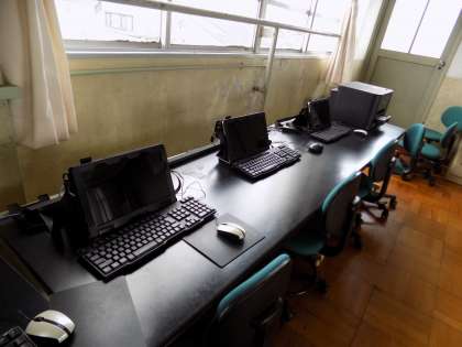北校舎の3階にコンピュータルームがあります。タブレットとして使うこともできるコンピュータやプログラミング学習ができるキットがそろっています。この部屋からの景色は最高です。比叡山がよく見えます。