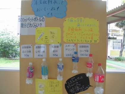 掲示されている内容を見ながら,ジュースには,たくさんの量の砂糖が入っているなとあらためて認識する時間となりました。