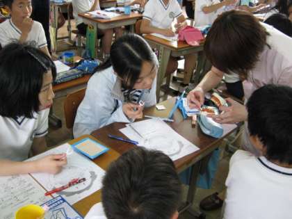 顎模型を使用し正しいフロッシング方法を少人数ずつ学習します。
