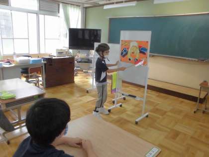 大きな虹の絵が完成しました!自分の作品を友達に見せ,工夫した所や頑張った所を発表し合いました。自分や友達の作品の良さを知ることができ,子どもたちはにこにこしながら鑑賞していました。子どもたちの作品は,教室に掲示しています。ぜひご覧下さい!