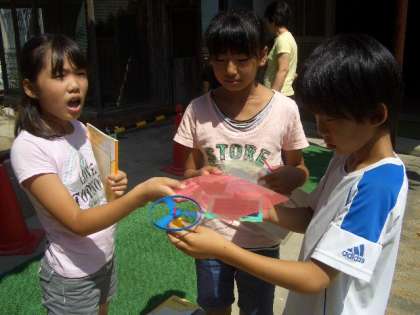 その後,ノートで光を遮ったり,日かげでやってみたり,半透明に下敷きで遮ってみたり・・・といろいろ実験してみました。