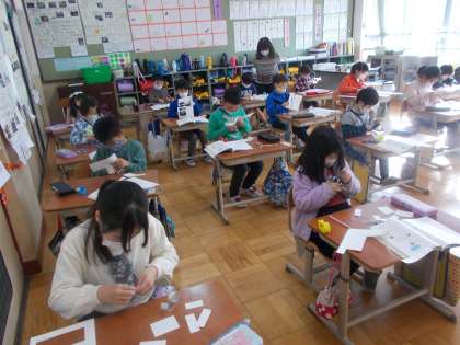 算数科「はこの形」の学習では,工作用紙に面をかきサイコロを作りました。面と面を貼り合わせる作業に子どもたちはとても真剣に取り組んでいました。少し大きめのすてきなサイコロができました。