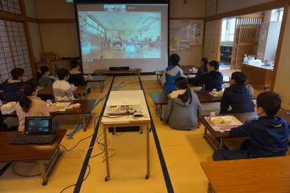 2月15日から給食週間が始まりました。例年ならふれあいサロンで2つの学年が一緒に給食を食べていましたが,緊急事態宣言が発令中ということもあり,高学年はふれあいサロン,低学年は教室でオンラインで交流します。今日は1年生と6年生の交流でした。黒板に大きな白い布を張り,プロジェクターで大きく画面を映し出し,まるで広い教室で向かい合って食べているようでした。消毒などの感染症対策をし,食べている間は「黙食」です。食べ終わってから6年生がクイズを出し,1年生が赤・青・黄色のカードを挙げて答えながら楽しい時間を過ごしました。