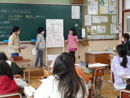 元町タイムでは,幸せな未来になるために,どのようなことが考えられるのかをテーマに学習を進めています。視覚しょう害のある方などのお話を聞いたことをもとに,プログラミングを使って何か役に立つものを作ることができないかを考えアイディアを練り上げています。今日は,ゲストティーチャーに来ていただき,アドバイスをもらいました。よりよいものになるように,さらに考えていってほしいと思います。