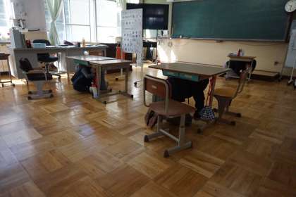 東日本大震災から10年目の3月11日,京都市で一斉に行われたシェイクアウト訓練に参加しました。緊急放送があり,子どもたちは机の下に入って身を守りました。当時のことを知らない子どもたちですが,新聞やニュースでいろんな情報を見聞きしていると思います。もしもの時どうすればいいのかご家庭で話してみてください。