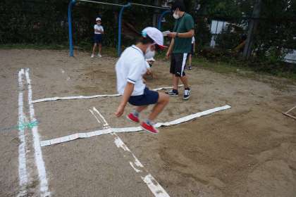 3年生は体育科で「はばとび」をしています。助走と踏み切り,着地に気をつけて練習しました。9月8日はグループ対抗で跳んだ距離の平均を競いました。友達が遠くまで跳んだ時には思わず歓声が上がっていました。