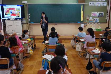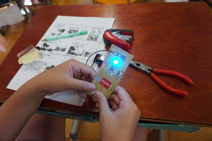 9月10日(金)4年生が「京都モノづくり体験学習」をしました。京都はモノづくり(先端産業)が盛んであることを知り,その技術や製品を生かしたモノづくりを体験しました。今日は半導体の光“LED”を使って電子工作をしました。子どもたちは細かい作業を丁寧にして,全員がLEDを7色に光らせることができ,とてもうれしそうでした。