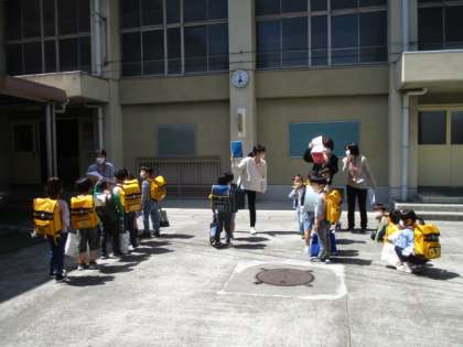 3校時が終わると,1年生は下校となります。体育館近くに集まり,色ごとに分かれた方面ごとで並んで帰りました。ドキドキの1日が終わりましたが,明日もまた元気に登校してきてください。