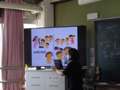 3年のテーマは「「血」ってふしぎだね」。血液の働きをしり,けがをしたらどのような処置をしたらよいのかを発表していました。1年生の時に保健指導いたことをよく覚えていましたね。また,友だちがけがをした時,血液には触れずに自分がしてあげられることを学習しました。