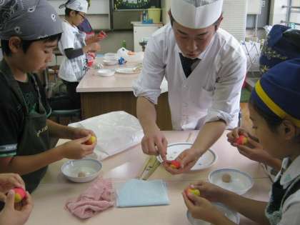 上田さんの手から次々に作られるいろいろな形の上生菓子に子どもたちの目は釘付けでした。作り方の手ほどきをうけ,いざ作ってみると,思ったような形にならず四苦八苦する姿も見られました。同じものは二度と作れない。でも,同じものをいくつもつくるという匠の技にたくさんの発見をしました。