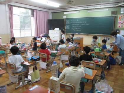 今日の5校時,1年生は図工ではこでつくったよの学習でした。今日は,作品に飾り付けをするのを頑張っていました。2年生は,体育でゆうぐあそびの学習でした。雨のやみ間に遊具の使い方を確認した後は,体育館でしっかりと体を動かしていました。