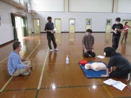 研修の後半には,心肺蘇生法の手順について確認しました。心臓マッサージやAEDの使用などを,練習用の人形を使いながら練習しました。