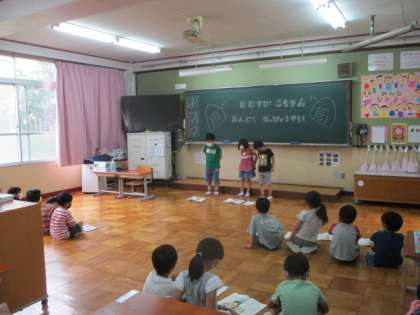 今日の5校時,ろ組ではジェンガを楽しんでいました。教頭先生との勝負では,果たしてどちらが勝利をおさめたのでしょうか。1年生は,国語でおむすびころりんの音読発表会をしていました。大きな声でしっかりと発表できていたので,読み終わると自然と大きな拍手が聞こえてきました。2年生は,音楽でさがしてつくろうの学習でした。身の回りにある様々な音を探しながら音楽を作っていました。