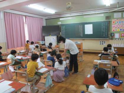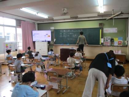 今日の5校時、1年生は国語でたのしいなことばあそびの学習でした。マス目に書かれているひらがなから隠れている言葉を探していました。2年生は、算数でたし算のひっ算の学習でした。3つの数のたし算について、どのようにひっ算をすればよいのかを考えていました。