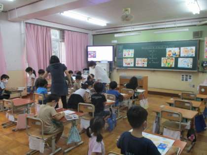 今日の5校時、1・2年生はどちらも図工の学習でした。1年生は、敬老ポスターを仕上げていました。2年生は、お話の絵の下絵を画用紙に描き写していました。