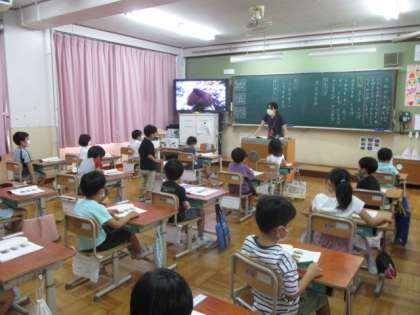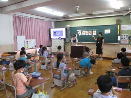 今日の5校時、1年生は国語でうみのかくれんぼの学習でした。2年生は、英語活動でALTの先生と楽しく学習をしていました。