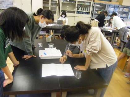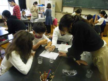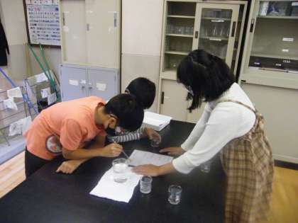 リトマス試験紙を使って,食塩水・アンモニア水・塩酸・石灰水・炭酸水(いずれもうすめたもの)の液性を調べました。それぞれ,丁寧に試験紙に水溶液をつけて,色が変わる様子を熱心に観察していました。