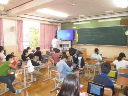 3年生は、図工でお話の絵の作品を仕上げていました。名札カードの書き方も担任の先生から教わっていたようです。4年生は、総合的な学習の時間でやさしいまち元町の学習でした。自分のタブレット端末でいろいろと調べていたようです。
