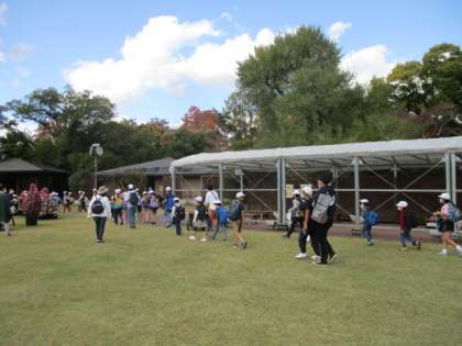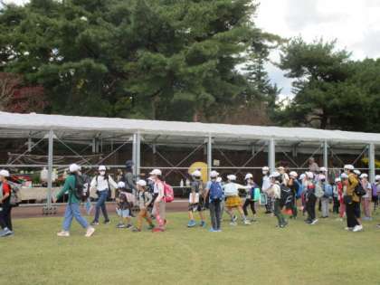 たてわりあそびを終えて、みんなで学校へ帰るときの様子です。だるまさんがころんだやおにごっこなどを楽しんでいました。