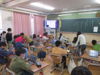 3年生は、社会で京都市の様子とくらしのうつりかわりの学習でした。教育実習の先生が京都市の変化の様子について授業をしていました。4年生は、国語で伝統工芸のよさを伝えようの学習でした。タブレット端末でいろいろと調べていたようです。