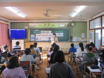 5年生は、算数で面積の学習でした。今回は平行四辺形の面積について、教育実習の先生が学習を進めていました。6年生は、外国語科でThis is my townの学習でした。京都のお気に入りの場所について自分で決め、紹介する内容をタブレット端末でいろいろと調べていました。