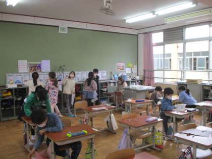 3年生は、漢字プリントの直しをしていました。書き直したら担任の先生のところへ行って確認してもらっていました。4年生は、給食カルタを考えていました。給食週間にむけて準備をしているようです。