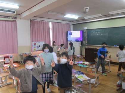 今日の3校時、1年生は算数でおなじかずずつの学習でした。2年生は、音楽でたまごのからをつけたひなどりのバレエの学習でした。