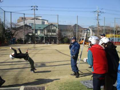 きれいな晴天のもと、今日は元町土曜塾「防災教室」が3年ぶりに実施できました。およそ30名ほどの子どもが参加し、消防分団長の挨拶や分団員・消防署員の紹介のあと起震車体験とロープ渡り体験を行いました。地震体験では、震度7の揺れを実際に感じることができたので、子どもたちの表情からは驚きと嬉しさが垣間見えました。ロープ渡り体験は、始まって以来のことなので少し心配でしたが、子どもたちはとても楽しそうにしていました。